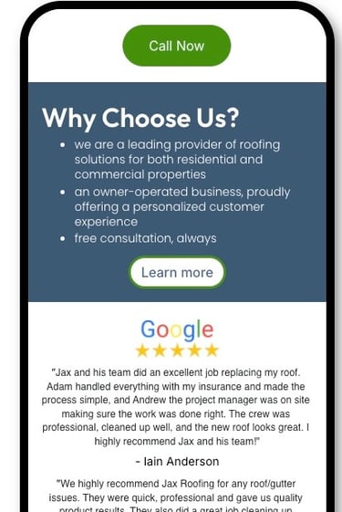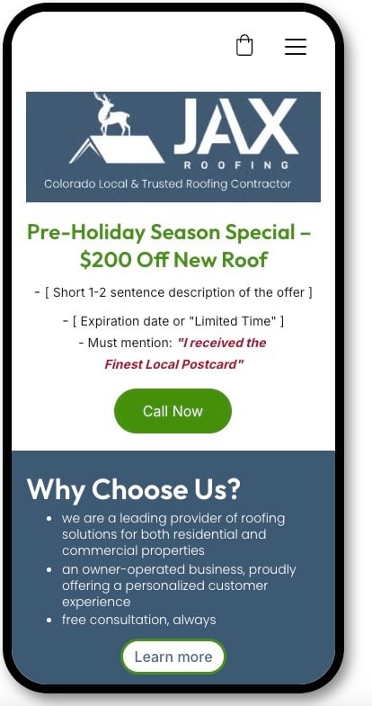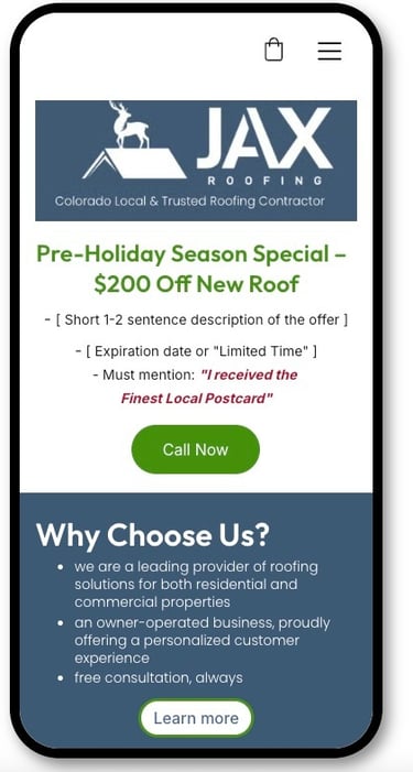 Our postcard leads homeowners straight to your mobile-friendly offer page, designed to convert interest into action. Promote seasonal specials, highlight why homeowners should choose you with testimonials, and make connecting effortless with Call Now / Learn More buttons.